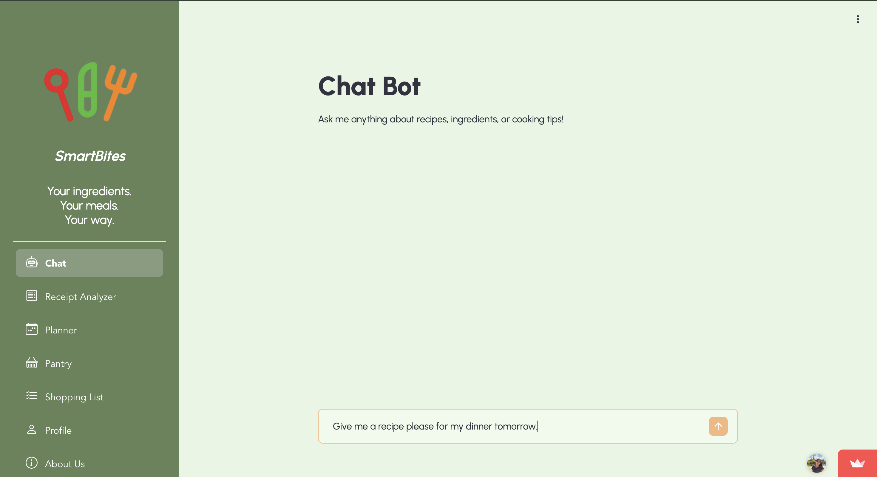 A Python-powered meal planning web app with AI chatbot interface and virtual pantry features.